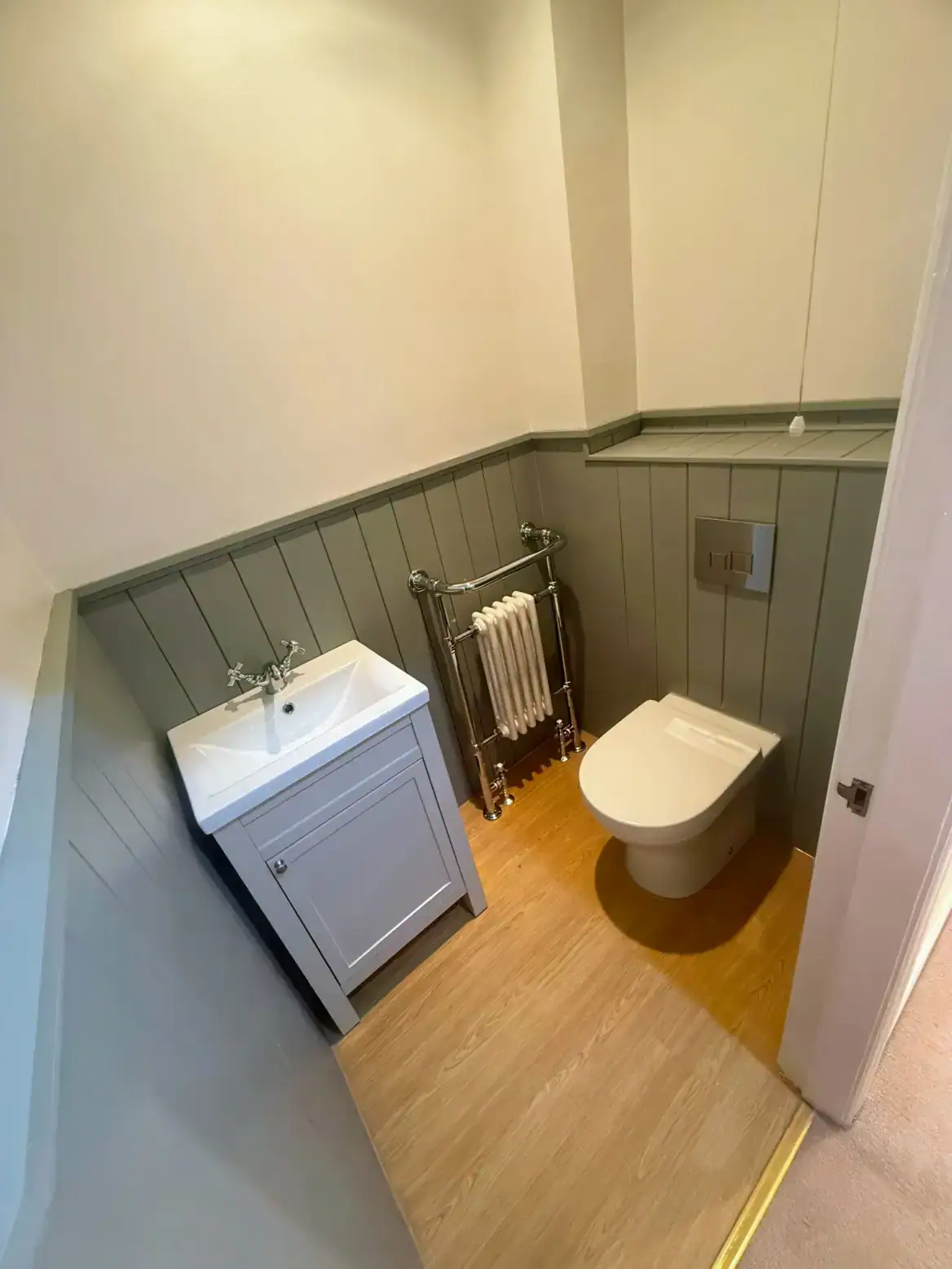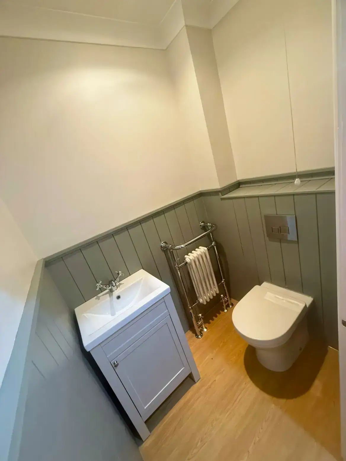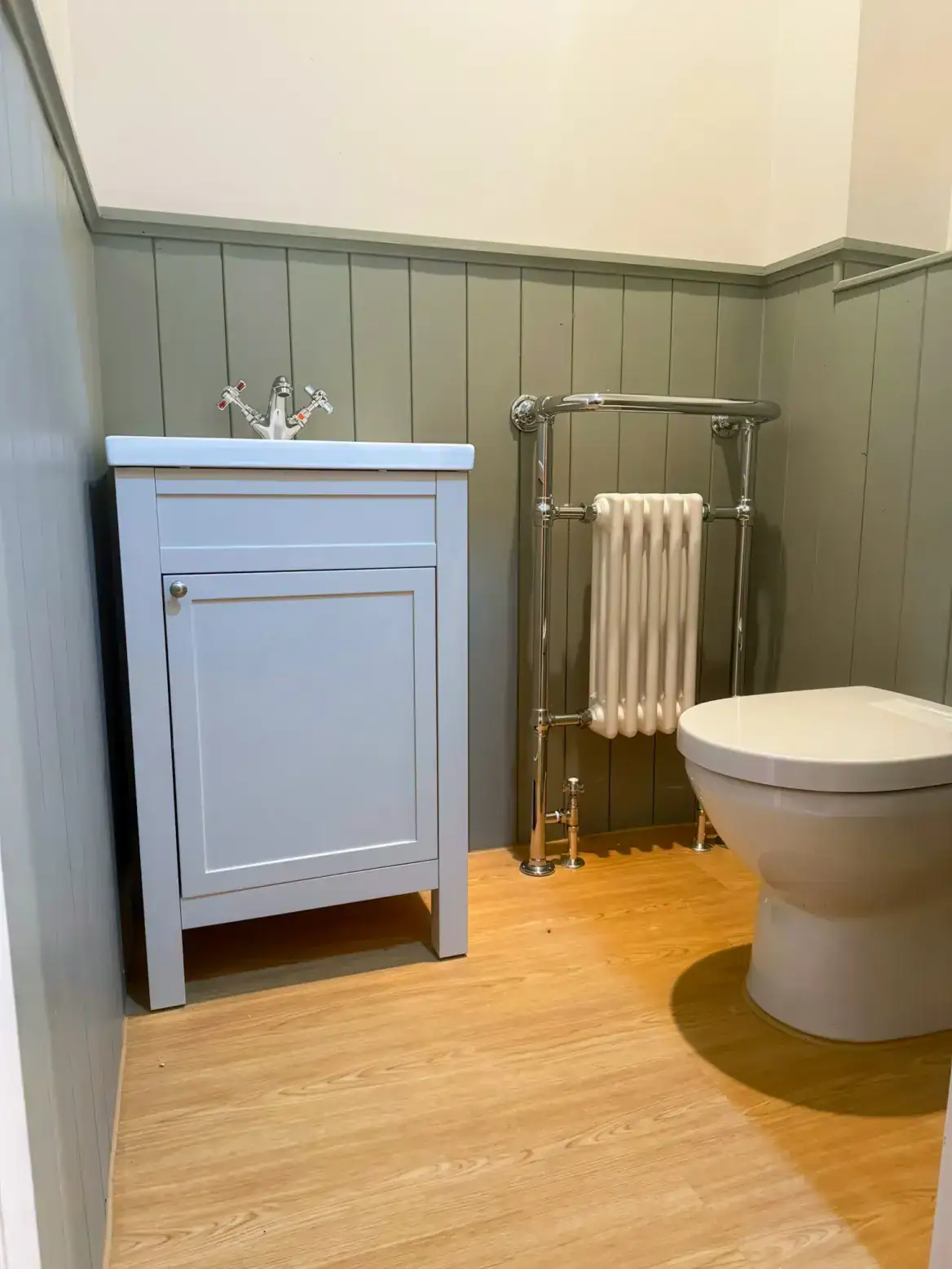 This characterful bathroom beautifully blends traditional detailing with practical functionality through its elegant tongue-and-groove panelling in sophisticated sage green. The painted wooden panels create warmth and texture, bringing cottage-style charm while providing durable, moisture-resistant wall coverage.