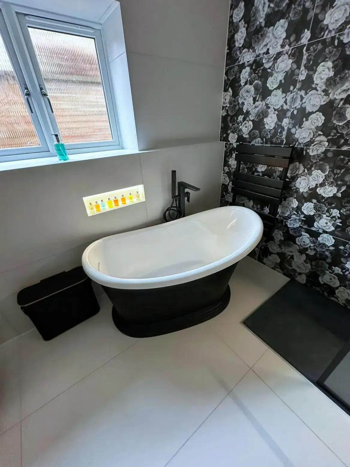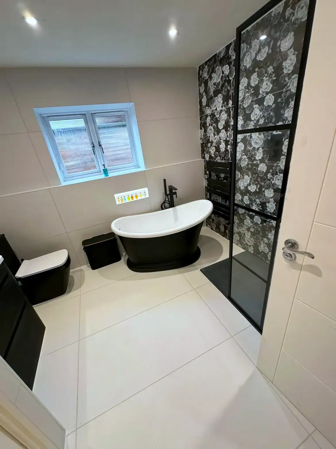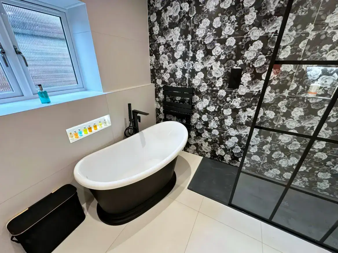 The striking black-framed grid shower screen echoes the dark tones beautifully, adding industrial elegance while allowing the spectacular wallpaper to shine through. A sculptural black freestanding bath with its distinctive curved base becomes a piece of functional art, perfectly complementing the room's dramatic aesthetic.