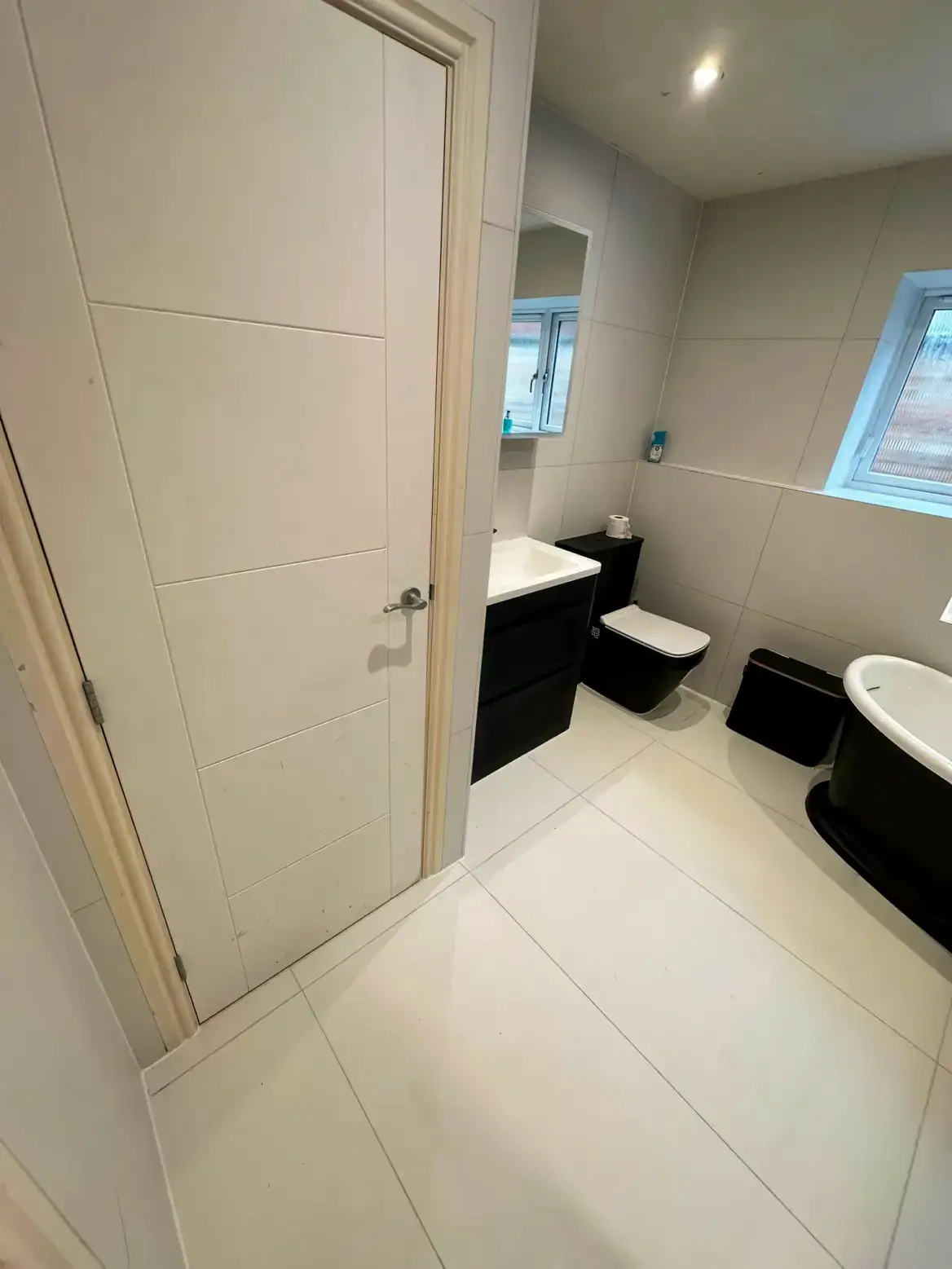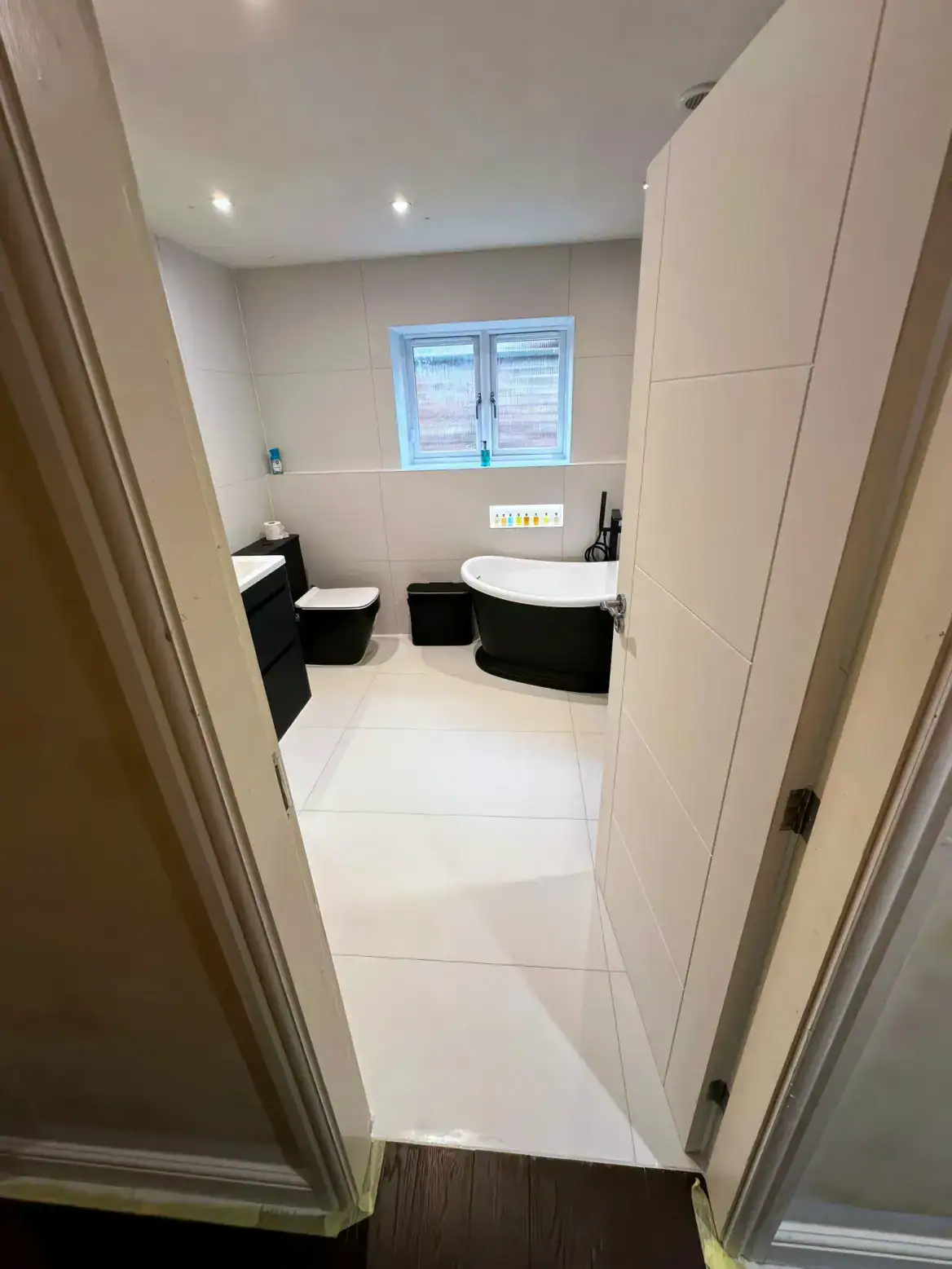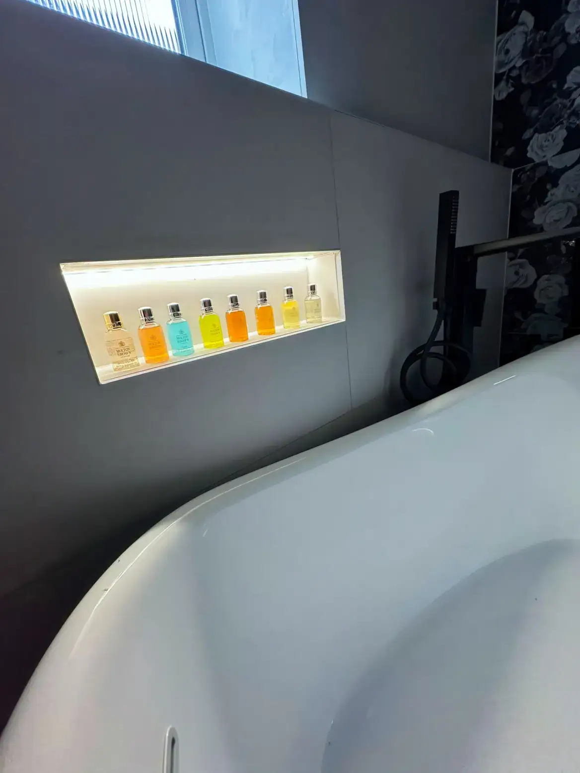 The striking black-framed grid shower screen echoes the dark tones beautifully, adding industrial elegance while allowing the spectacular wallpaper to shine through. A sculptural black freestanding bath with its distinctive curved base becomes a piece of functional art, perfectly complementing the room's dramatic aesthetic.