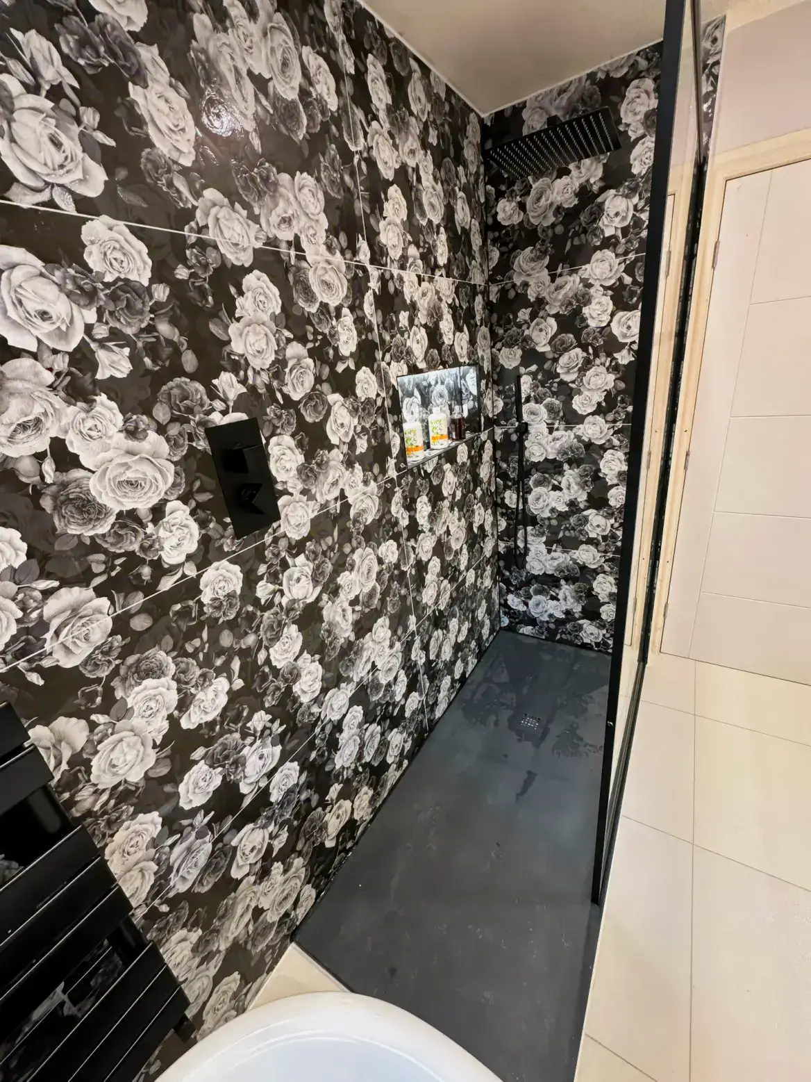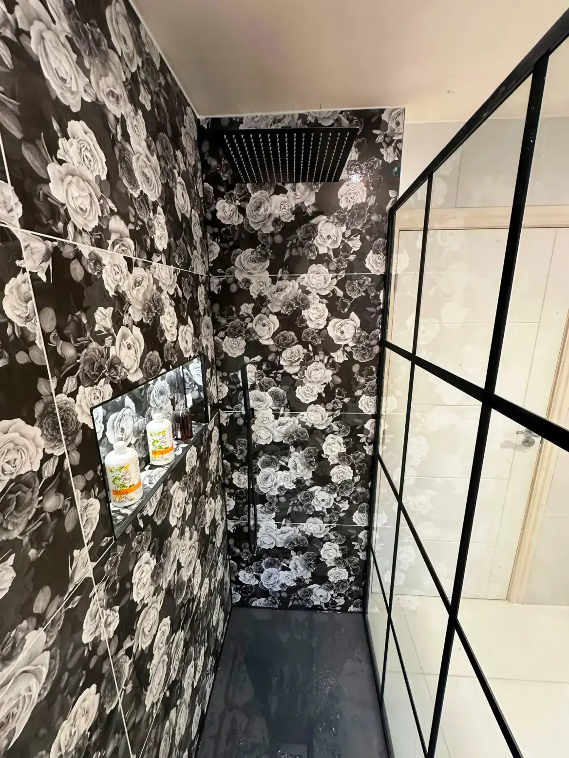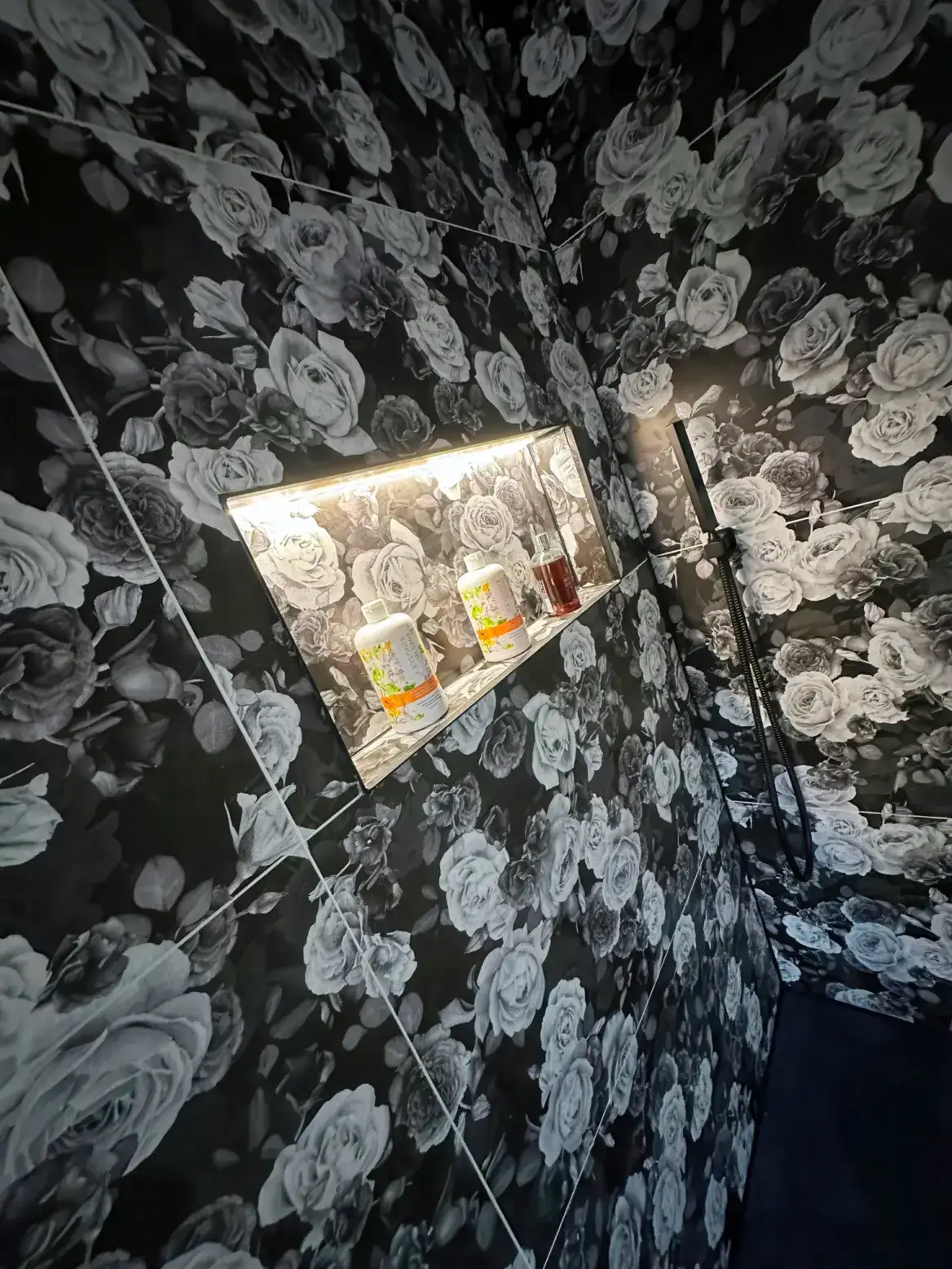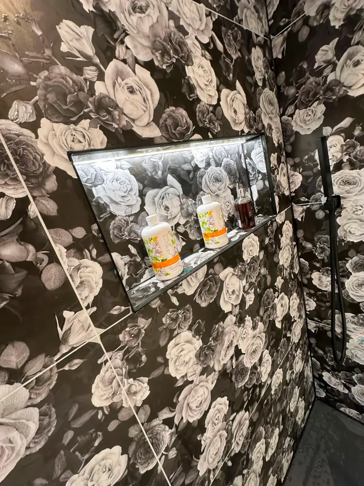 This stunning bathroom makes an unforgettable statement with its dramatic dark floral wallpaper featuring cascading roses and peonies in shades of charcoal, grey, and white. The bold botanical pattern creates immediate visual impact, transforming the space into something truly extraordinary.