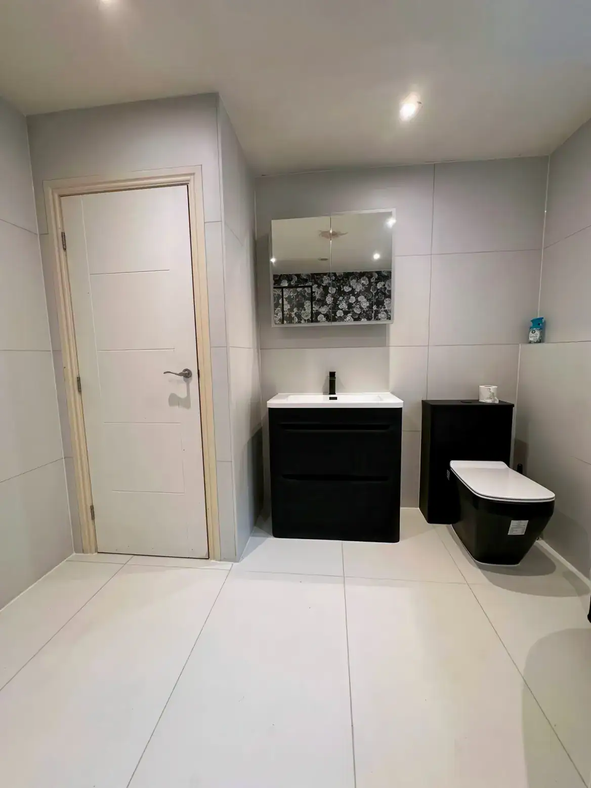 Sleek black sanitaryware and vanity units maintain the monochromatic theme with sophisticated consistency, while crisp white walls and flooring provide essential balance, preventing the bold elements from overwhelming. Strategic LED lighting within recessed niches adds ambient glow and practical storage. This bathroom demonstrates exceptional design confidence, proving that bold pattern and dark tones can create genuine luxury.