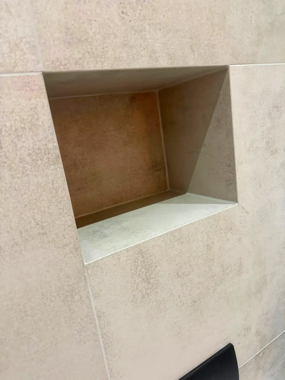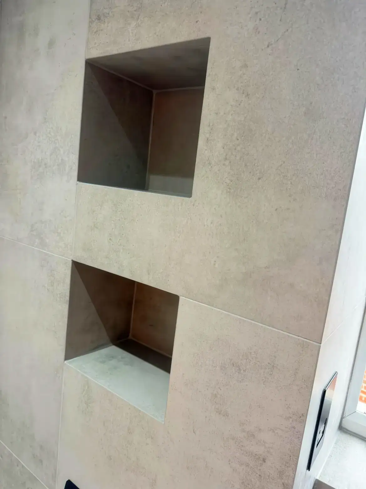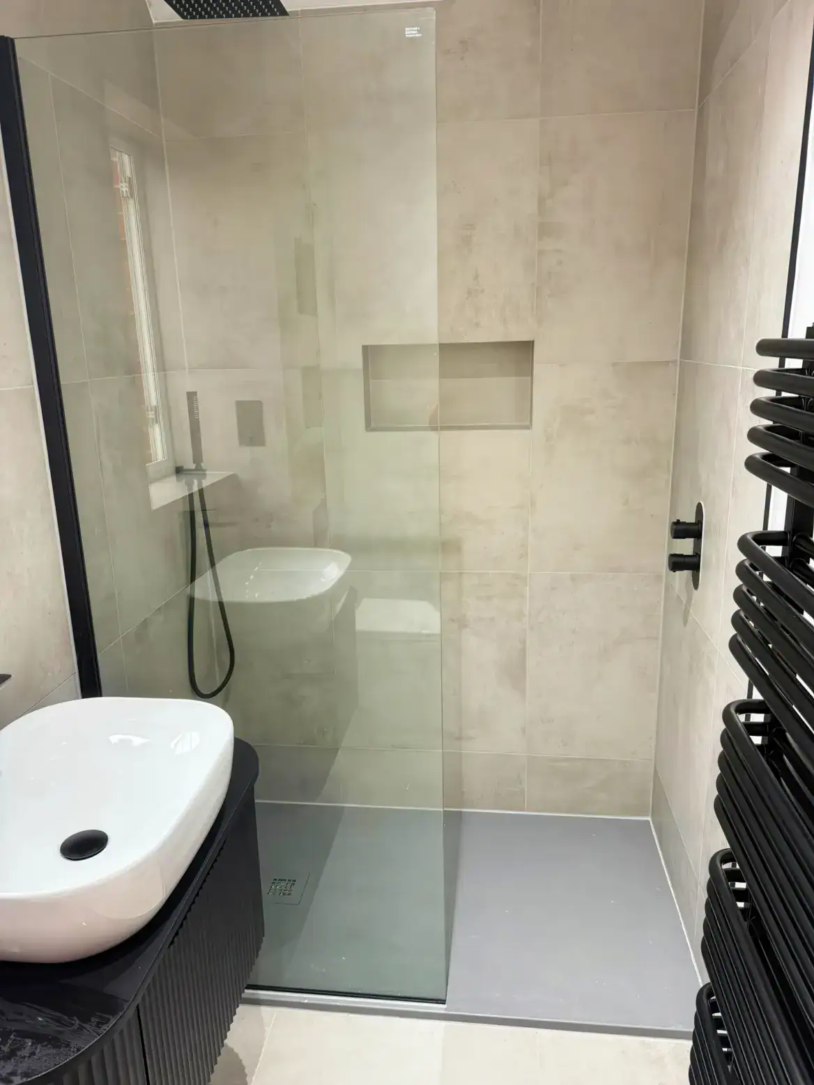Seamless glass shower screening maintains the room's open, airy feel, while thoughtfully positioned recessed niches offer practical storage without protruding into the space. Wall-hung sanitaryware reinforces the floating aesthetic and makes floor cleaning effortless. The result is a bathroom that feels serene, spacious, and unmistakably contemporary, proving that restrained design choices can create maximum impact.