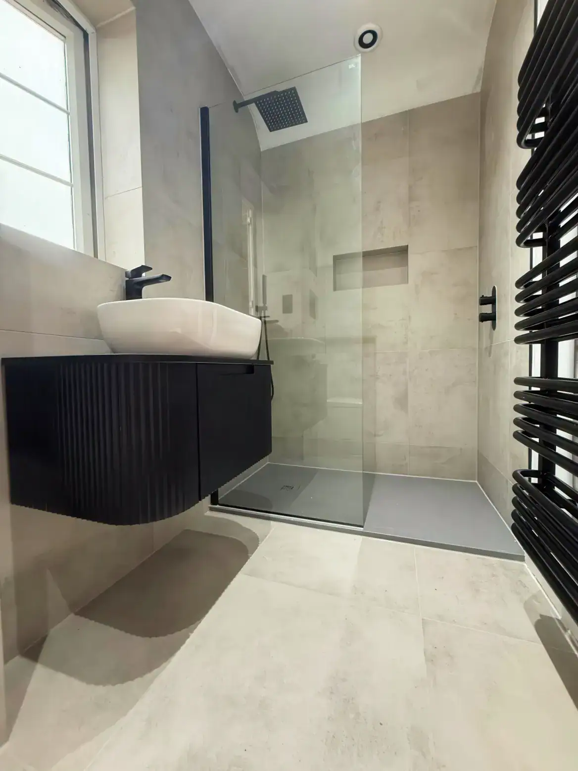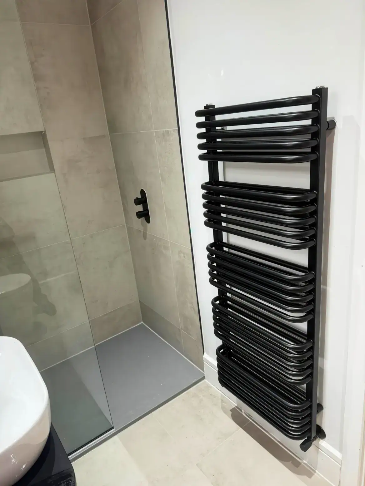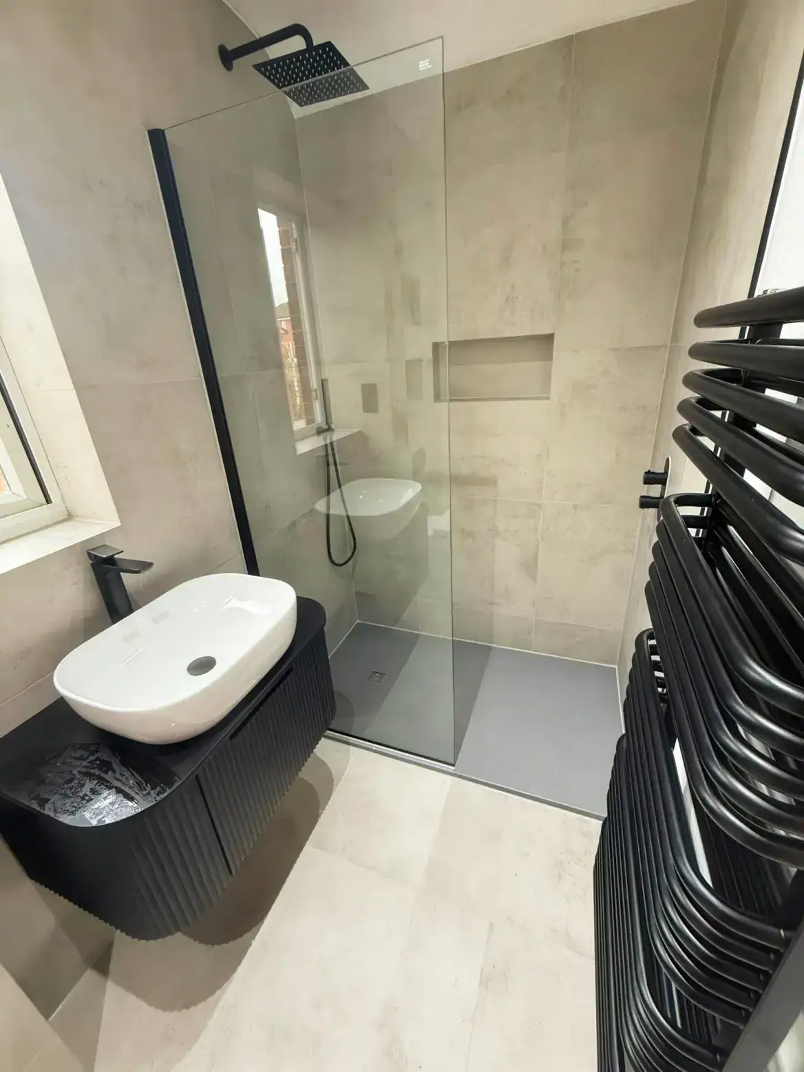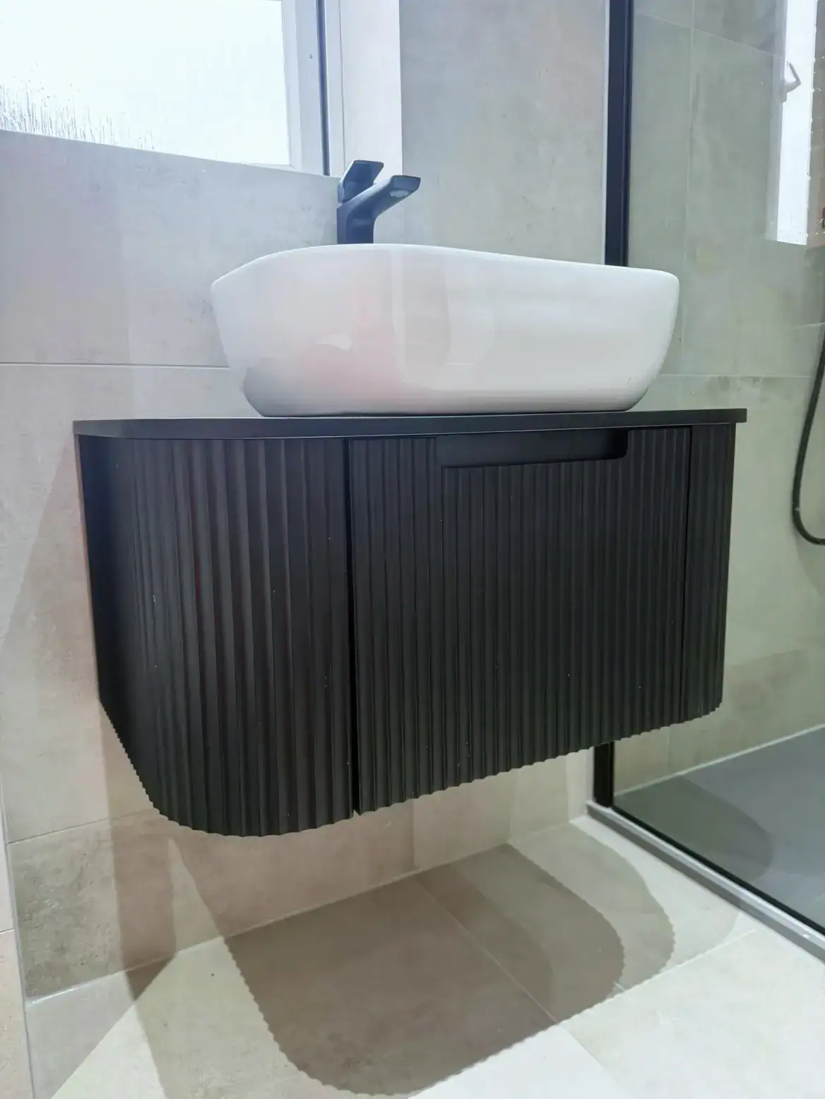The striking black fluted vanity unit with its contemporary vessel basin becomes a sculptural focal point, its ribbed detailing adding tactile interest and modern edge. Matte black fixtures throughout, including the dramatic curved heated towel rail and sleek shower fittings, provide bold contrast against the pale grey scheme.